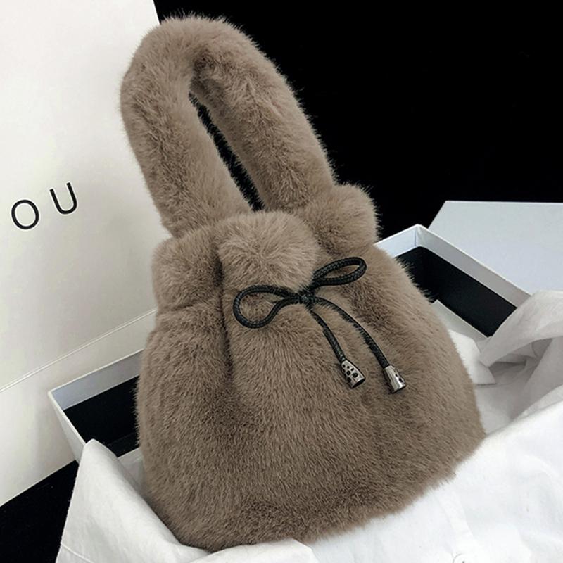 Solid Color Fur Bucket Bag Shoulder Bags For Women 2021 Winter Designer Handbag High Quality Soft Warm Lady Crossbody Bag, Black
