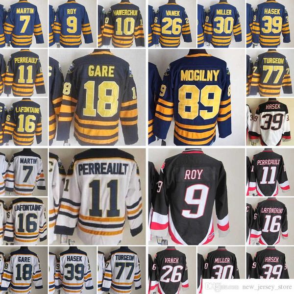 1970-1999 movie retro ccm hockey jersey embroidery 7 rick martin 9 derek roy 10 hawerchuk 11 gilbert perreault lafontaine gare vanek miller, Black;red