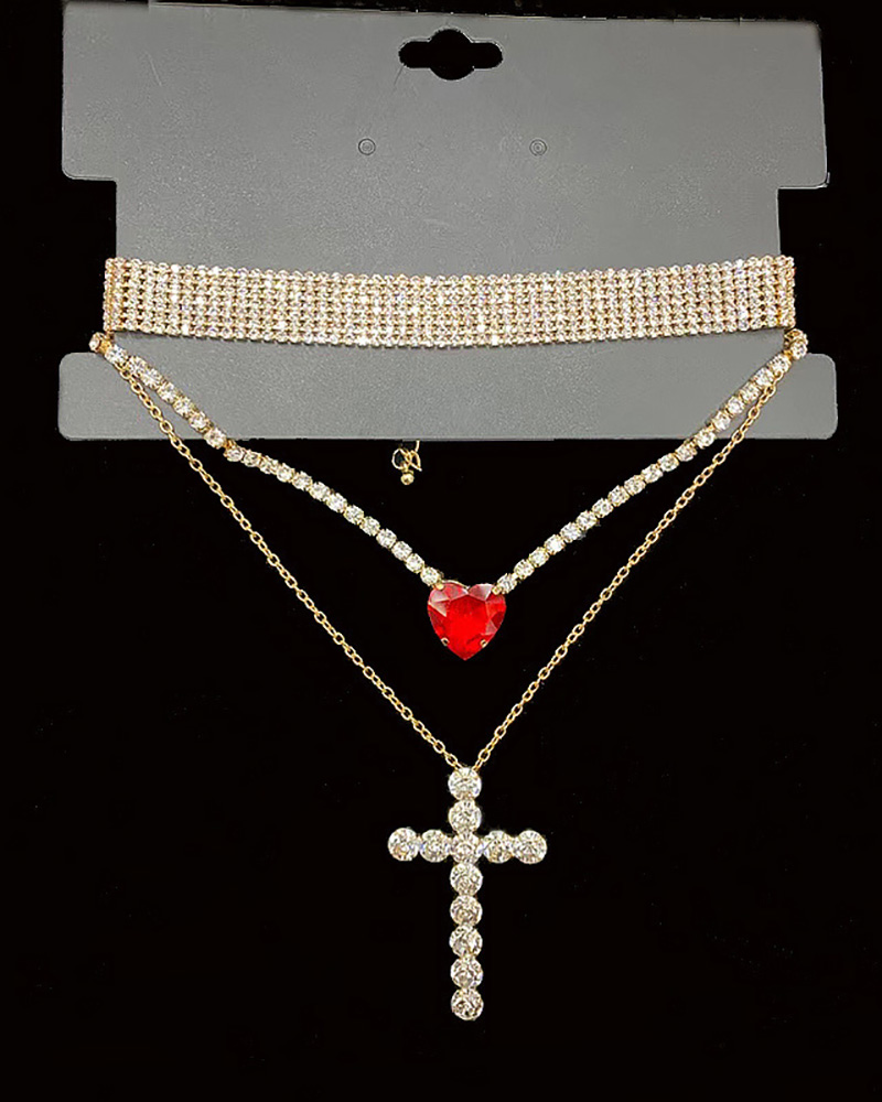 1PC Allover Rhinestone Heart Cross Pendant Necklace, Red