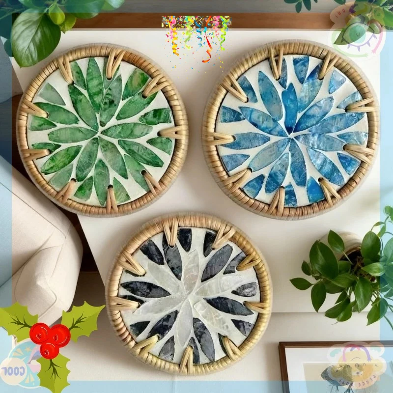 1PC Vietnamese Rattan Coasters, Shell Inlaid Heat Resistant Mat for Cups, Teapot & Hot Dishes, Table Protector