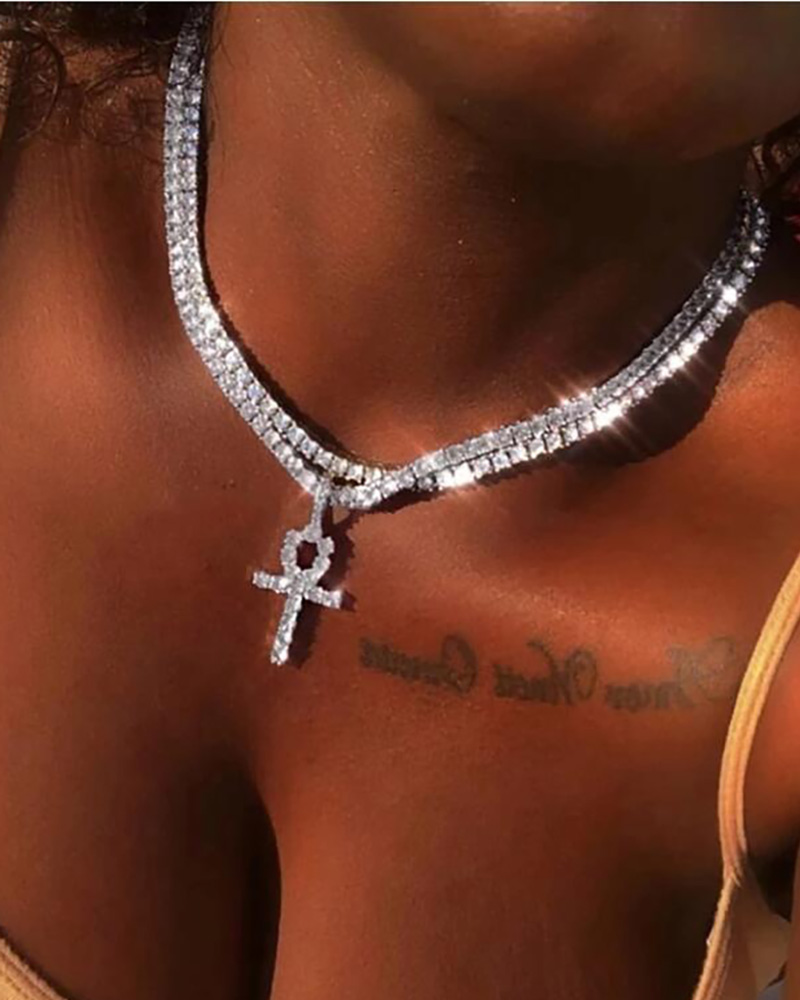 1PCS Cross Pattern Rhinestone Pendant Necklace, Silver