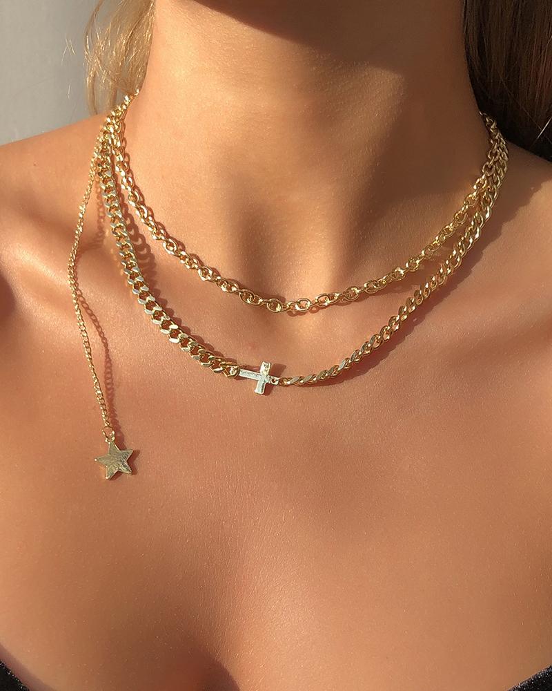 1PCS Simple Cross Star Pendant Layered Chain Necklace, Gold