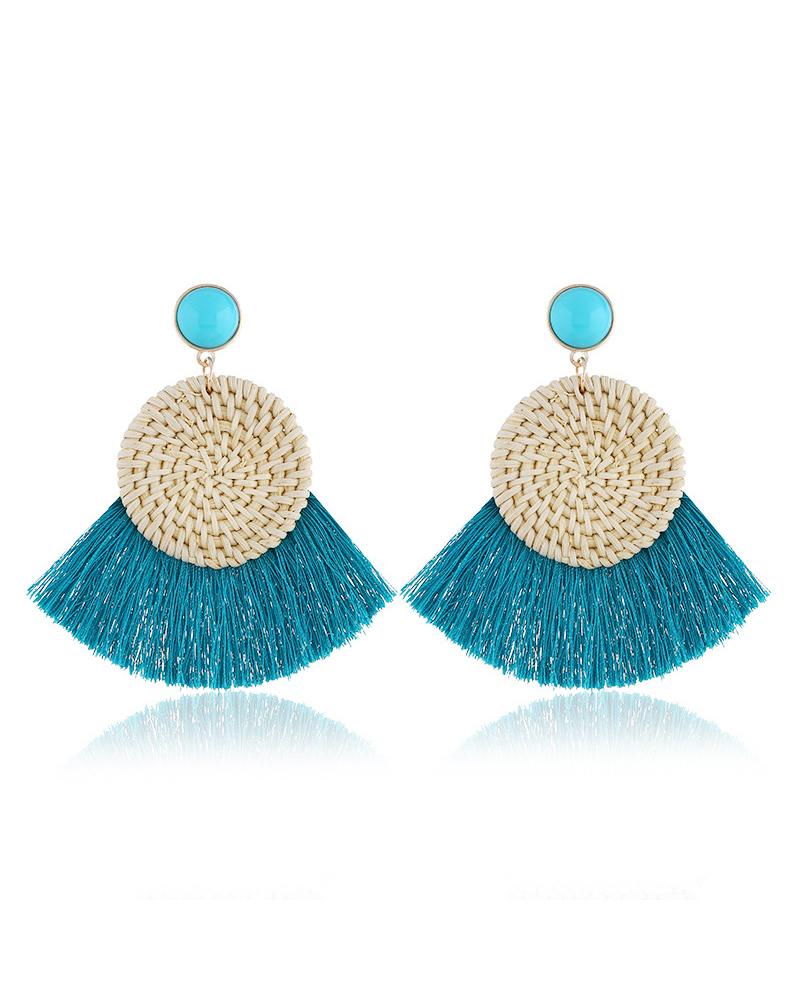 1Pair Big Lightweight Geometric Statement Tassel Rattan Earrings, Blue