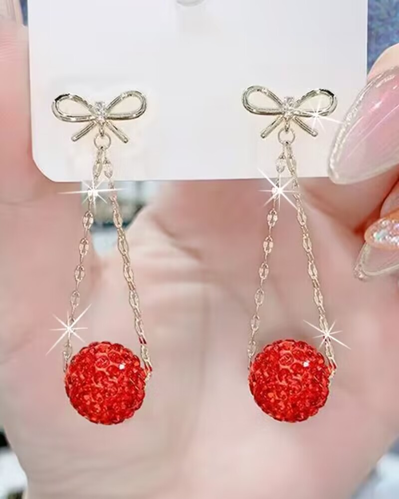 1Pair Bowknot Ball Pattern Rhinestone Drop Earrings, Red