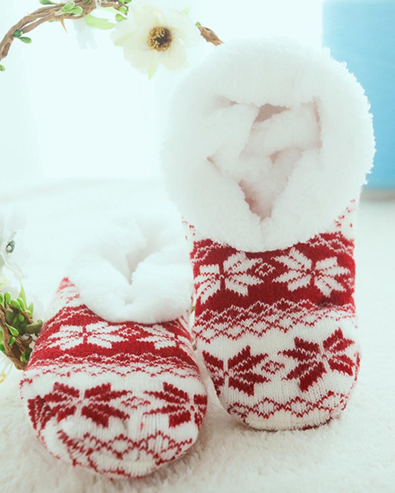 1Pair Christmas Snowflake Aztec Geometric Pattern Non-Slip Fuzzy Thermal Socks, Red