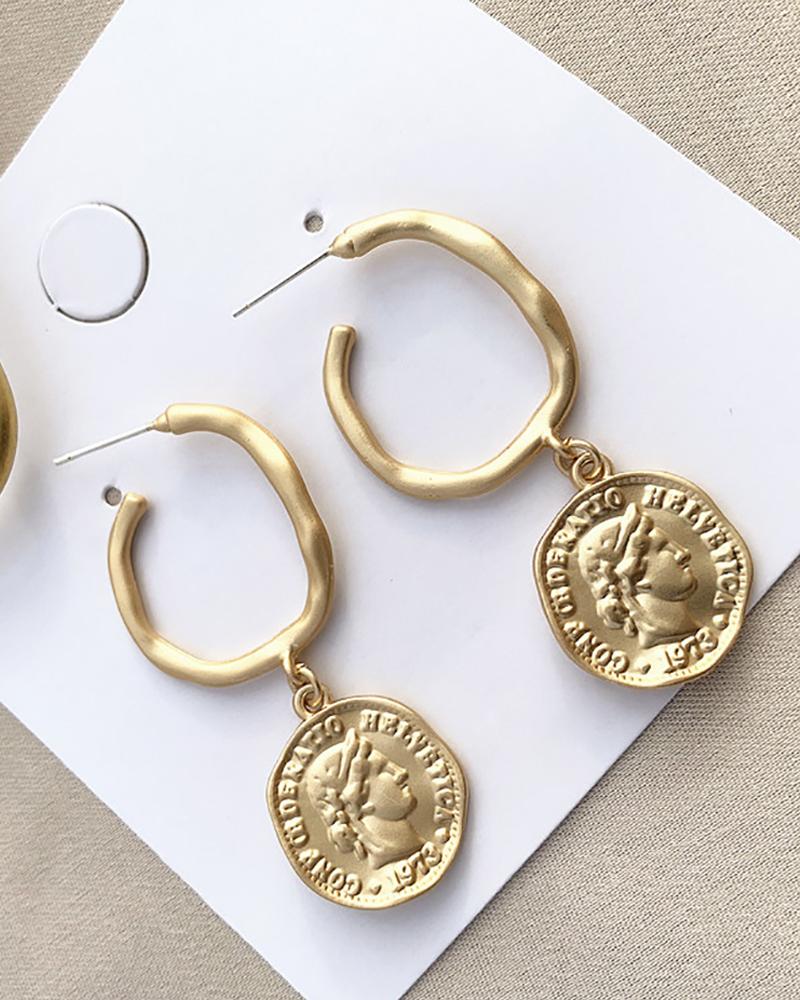 1Pair Coin Pattern Circle Earrings, Gold