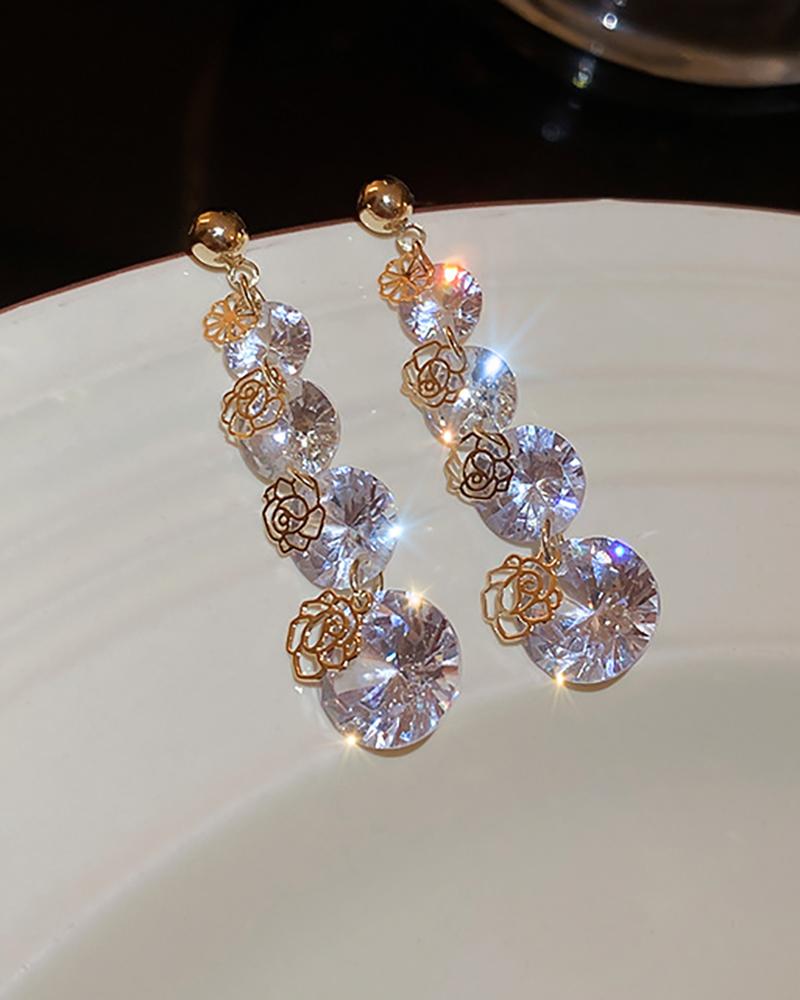 1Pair Floral Pattern Rhinestone Drop Earrings, Silver