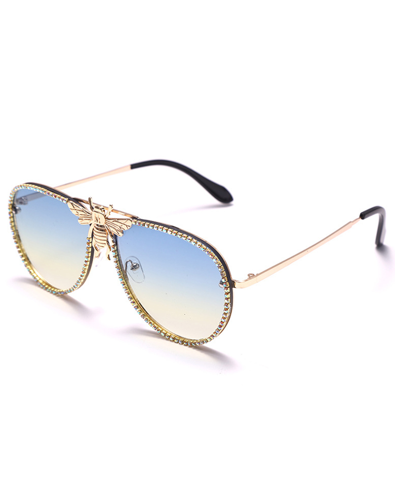 1Pair Gradient Rhinestone Bee Pattern Trendy Pilot Sunglasses, Style3
