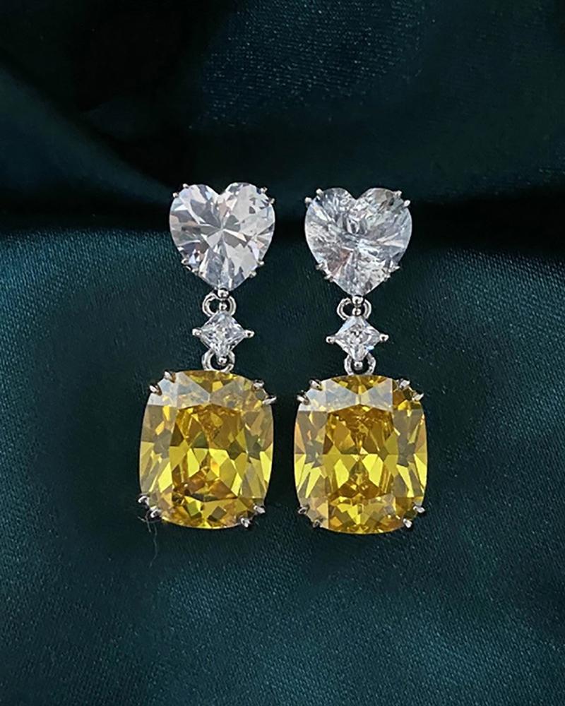 1Pair Heart Pattern Square Pendant Rhinestone Earrings, Yellow