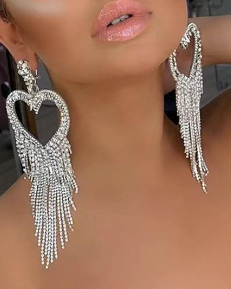 1Pair Heart Pattern Studded Tassel Rhinestone Drop Earrings, Silver