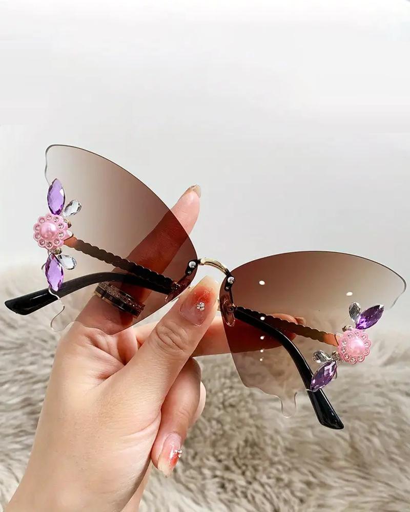 1Pair Rhinestone Butterfly Shaped Rimless Sunglasses, Brown