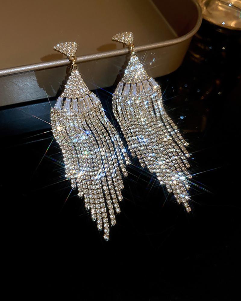 1Pair Rhinestone Fan Tassel Drop Earrings, Silver