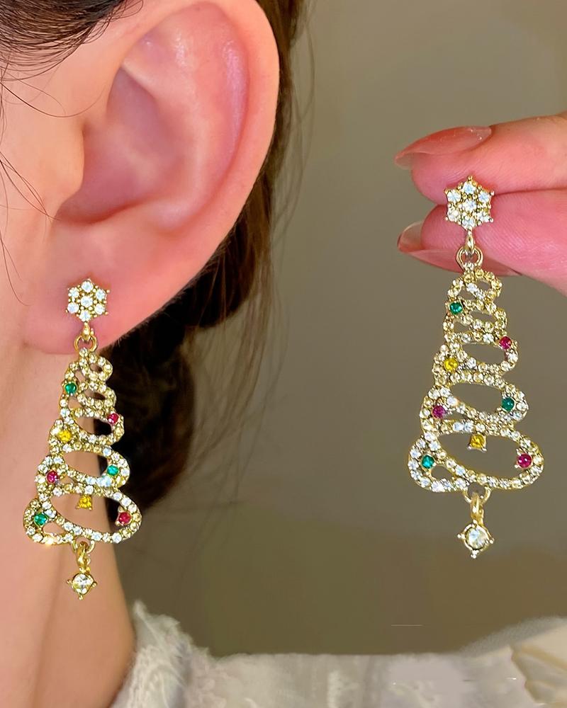 1Pair Rhinestone Hollow Christmas Tree Dangle Earrings, Gold