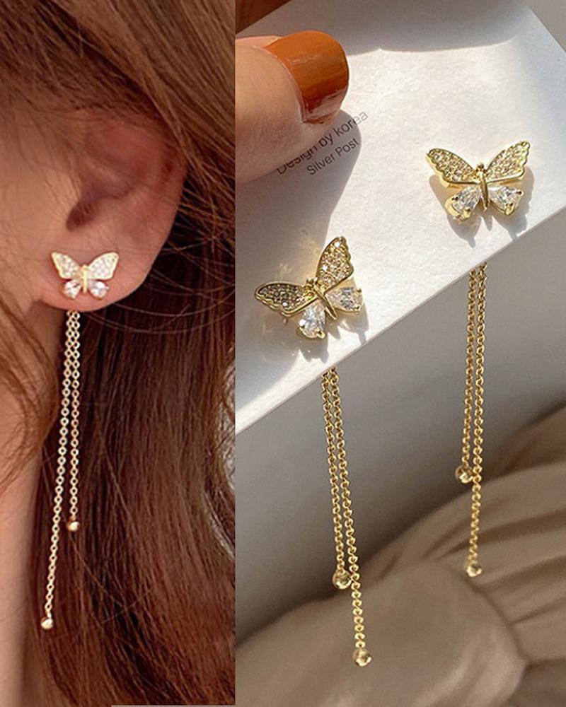 1Pair Rhinestone Tassel Butterfly Pattern Drop Earrings, Gold