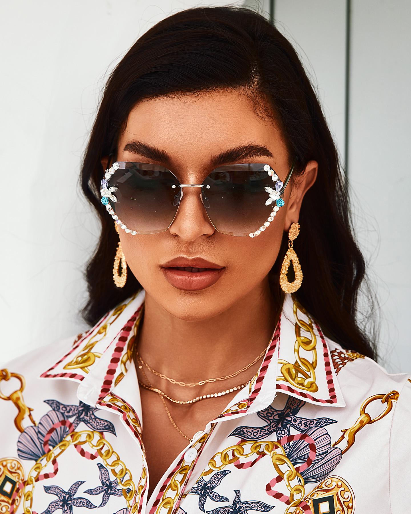 1Pair Rimless Rhinestone Decor Asymmetrical Frame Sunglasses, Black
