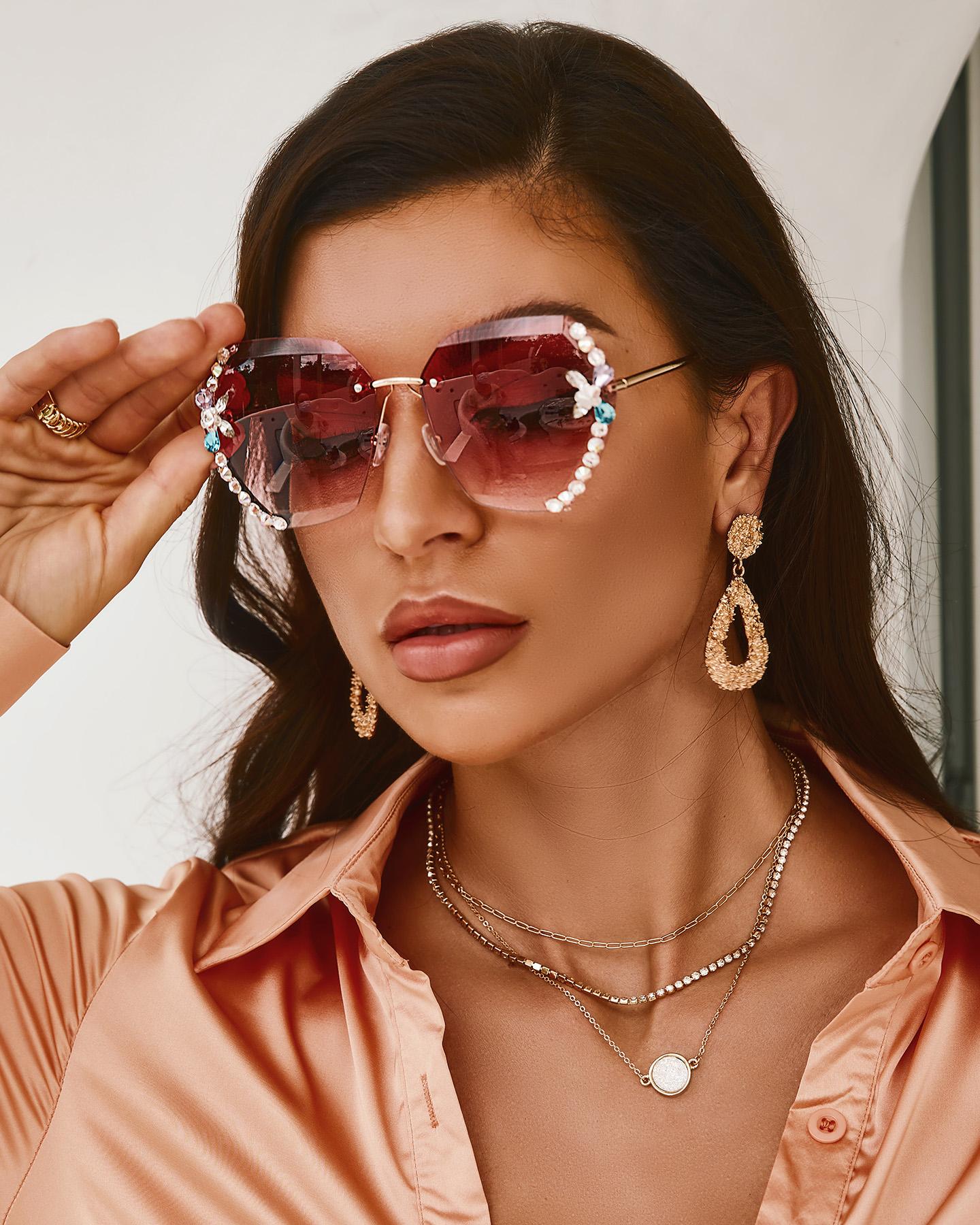 1Pair Rimless Rhinestone Decor Asymmetrical Frame Sunglasses, Pink