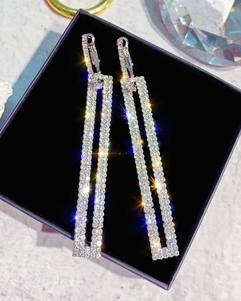 1Pair Sparkling Rhinestone Geo Decor Hoop Earrings, Silver