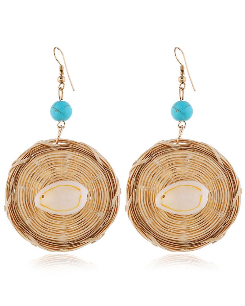 1Pair Straw Shell Starfish Pattern Geometric Rattan Earrings, Style2