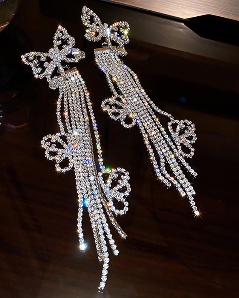 1Pair Tassel Rhinestone Butterfly Pattern Earrings, Silver