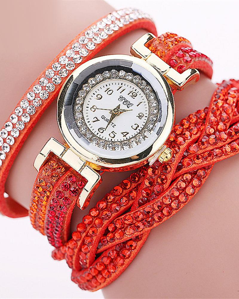 1pc Allover Rhinestone Braided Bangle Quartz Watch, Orange