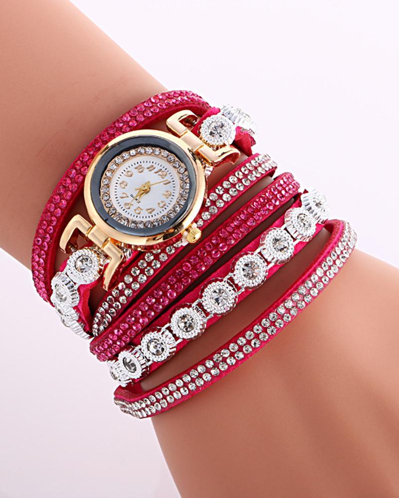 1pc Allover Rhinestone Stackable Bangle Quartz Watch, Hot pink