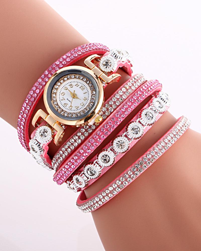 1pc Allover Rhinestone Stackable Bangle Quartz Watch, Pink