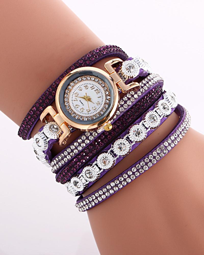 1pc Allover Rhinestone Stackable Bangle Quartz Watch, Purple
