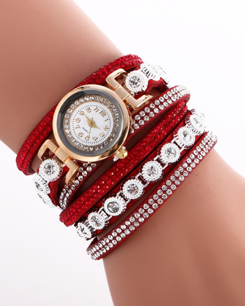1pc Allover Rhinestone Stackable Bangle Quartz Watch, Red