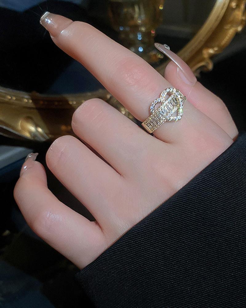 1pc Hollow Out Rhinestone Heart Shaped Ring, Gold
