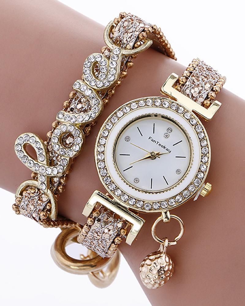 1pc Rhinestone Decor Lover Letter Pattern Bangle Quartz Watch, Beige