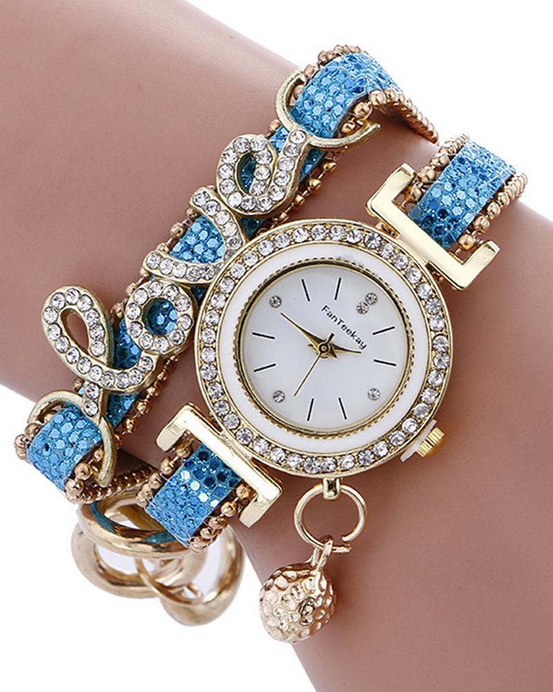 1pc Rhinestone Decor Lover Letter Pattern Bangle Quartz Watch, Turquoise blue