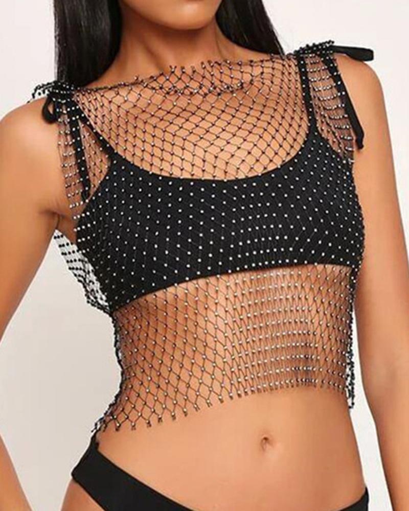 1pc Rhinestone Fishnet Sleeveless Tank Body Chain, Black