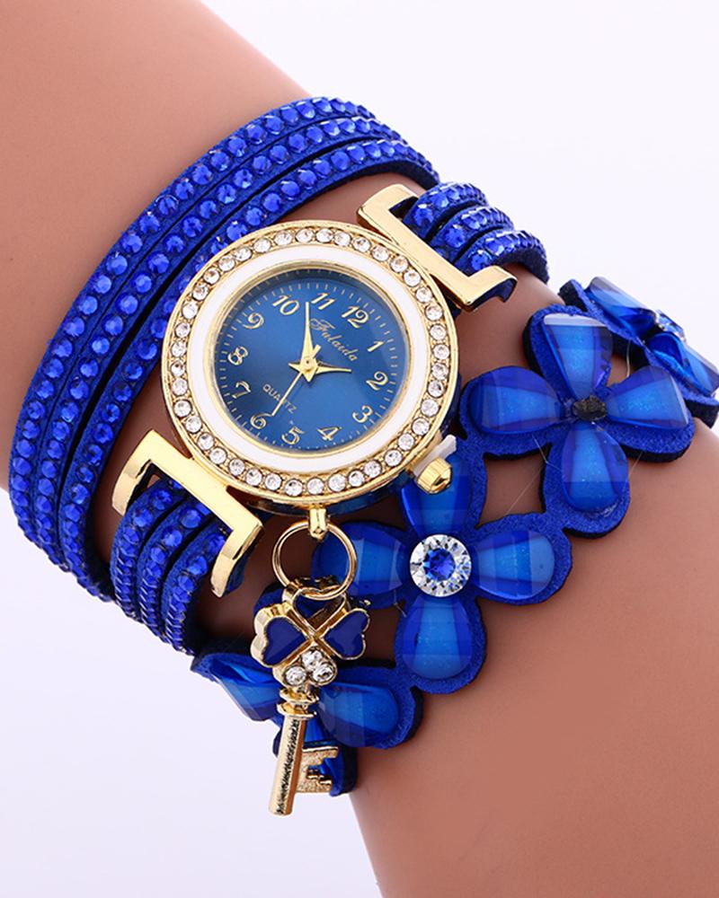 1pc Rhinestone Floral Pattern Key Pendent Bangle Quartz Watch, Blue