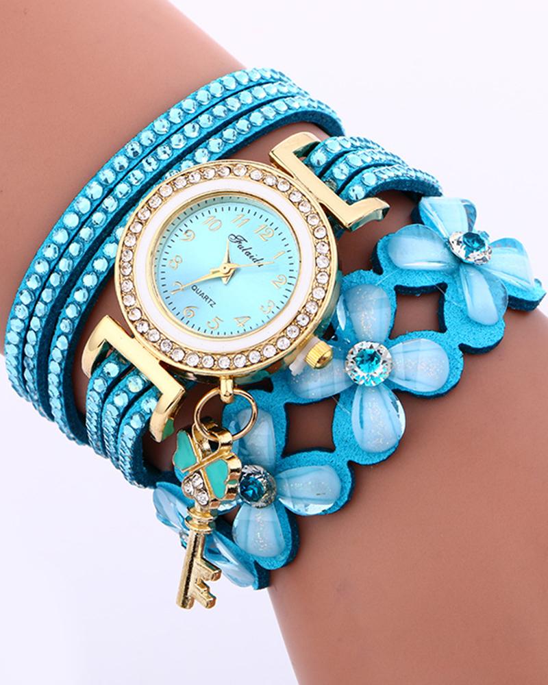 1pc Rhinestone Floral Pattern Key Pendent Bangle Quartz Watch, Lighted blue
