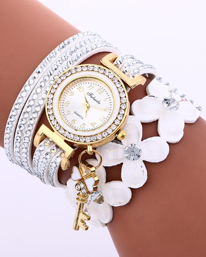 1pc Rhinestone Floral Pattern Key Pendent Bangle Quartz Watch, White