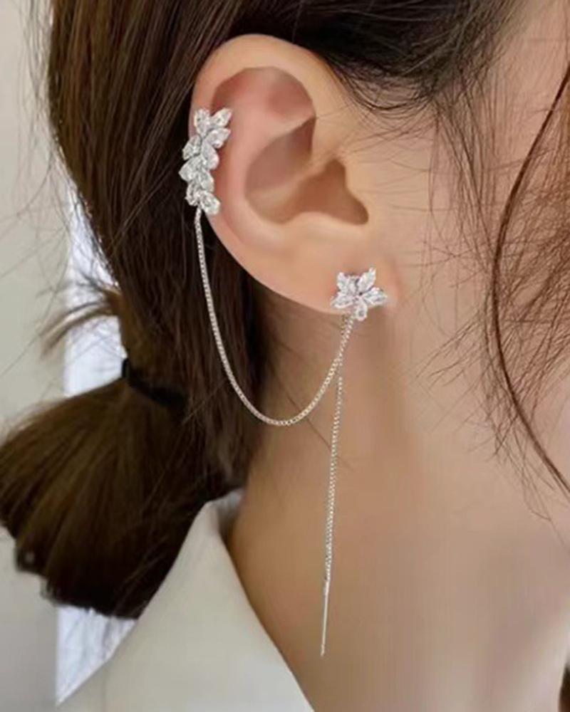 1pc Rhinestone Floral Pattern Tassel Ear Clip, Silver