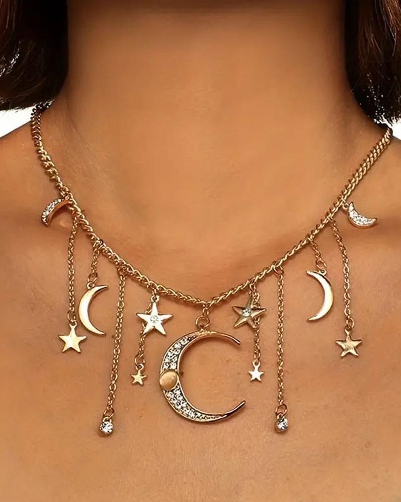 1pc Rhinestone Moon Star Tassel Pendant Necklace, Gold