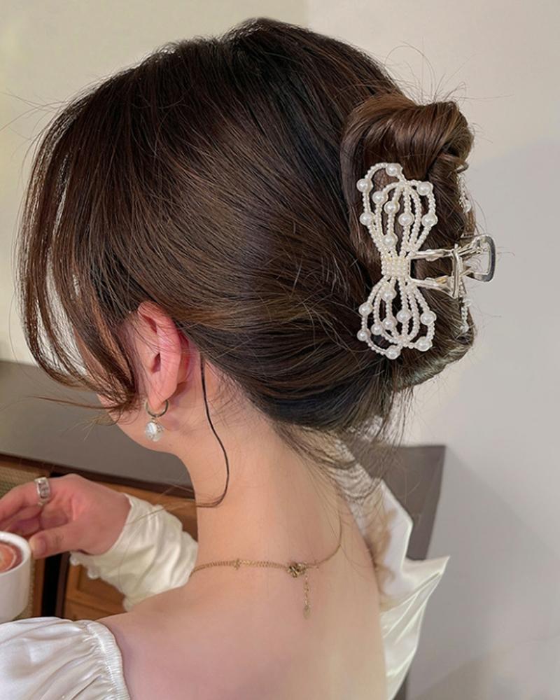 1pc Rhinestone Pearls Bowknot Shaped Hair Claw, Style2