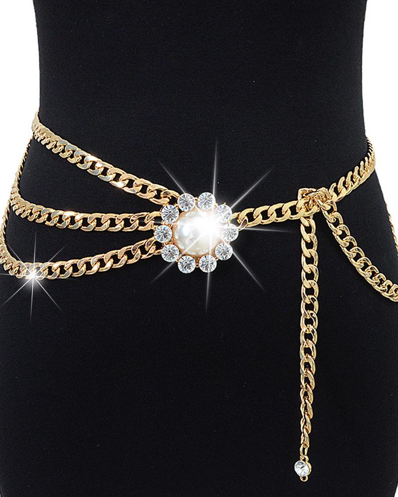 1pc Rhinestone Pearls Decor Layered Waist Chain, Gold