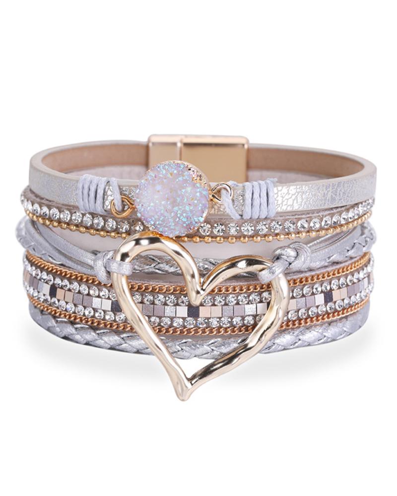 1pc Tribal Multi-layer Heart Pattern Rhinestone Magnet Wide Bracelet, Silver