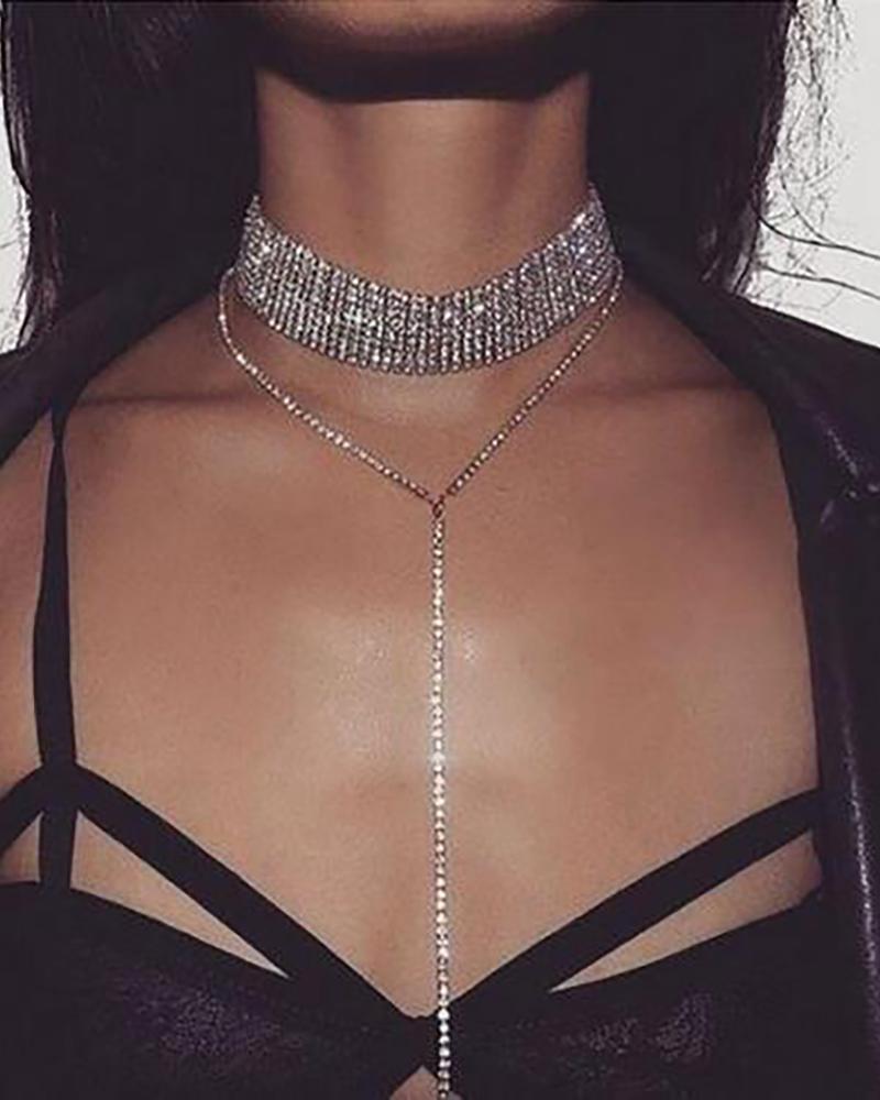 the choker design rhinestone dotted with the white crystal, the classic and elegant design always keep pace with fashion; Easy to match any outfits; It makes you impressive anytime any occasion. The choker necklace is applied for daily or night club jewelry; Very beautiful and fashionable, shinny body chain for your charming look.
