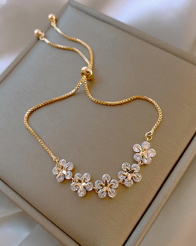 1pcs Adjustable Rhinestone Floral Pattern Chain Bracelet, Gold