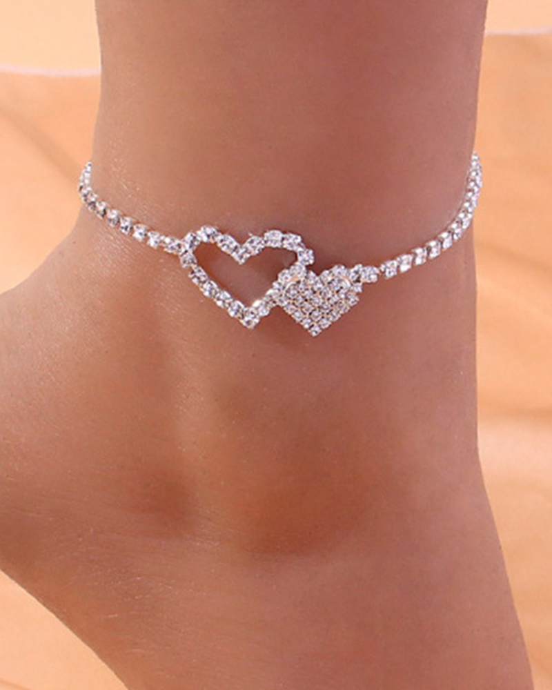 1pcs Double Layered Heart Rhinestone Anklet, Silver