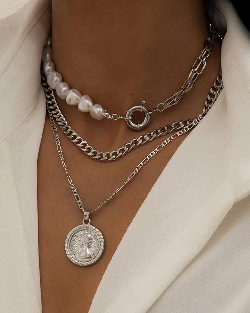 1pcs Multi-Layered Pearls Beaded Embossed Disc Pendant Necklace, Silver