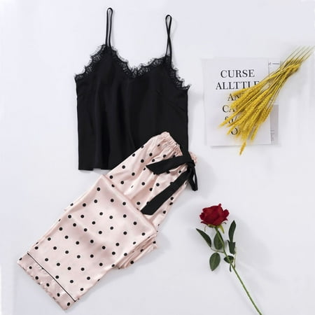 Women Dot Print Lace Strap Underwear Sleepwear And Long Pants Pajamas 2PC Suits Sets Size XL