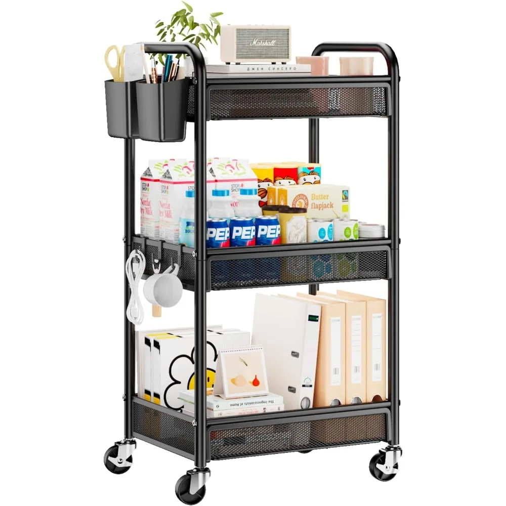 3 Tier Rolling Cart – Metal Utility Storage Cart with Wheels, Craft Cart Organizer with Hanging Cups, Hooks, Mesh Basket for Be