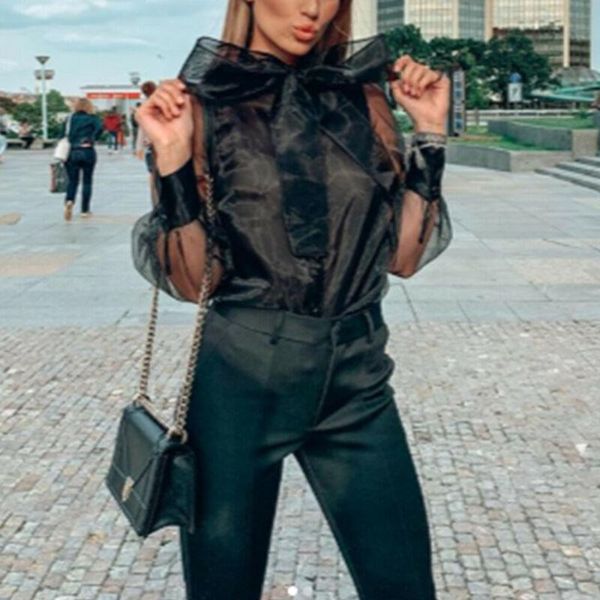 us new women see-through long sleeve loose chiffon blouses club elegant bow tie blouse work plain, White