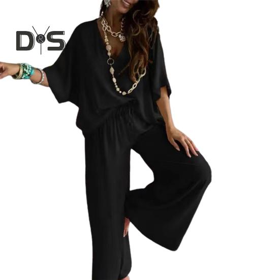 2 шт./комплект, женские летние топы с V-образным вырезом и рукавами «летучая мышь», высокая талия, эластичный пояс, широкие длинные брюки, однотонный свободный покрой, повседневный наряд 2XL чёрный