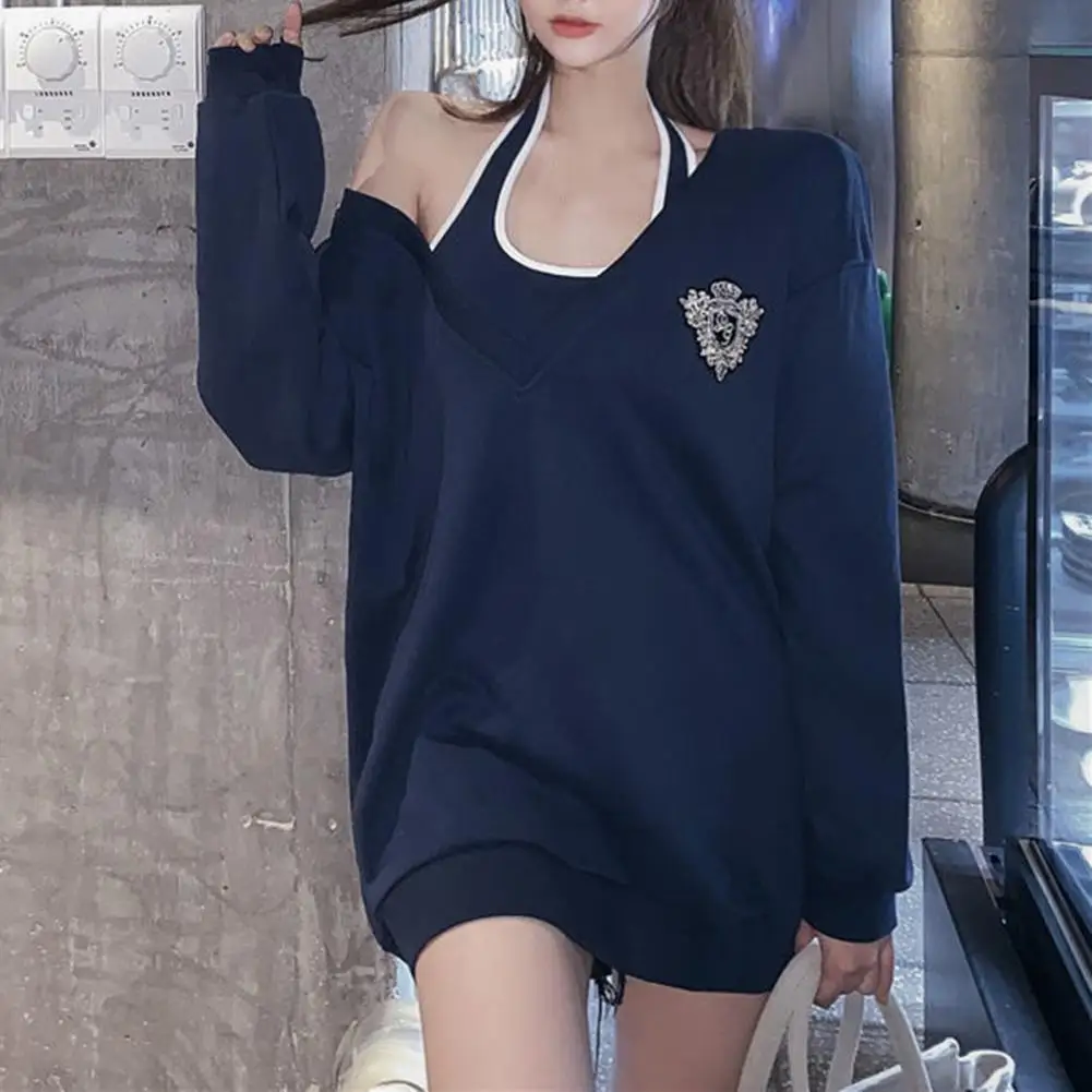 2 шт./комплект, женский свободный пуловер средней длины с V-образным вырезом и длинным рукавом