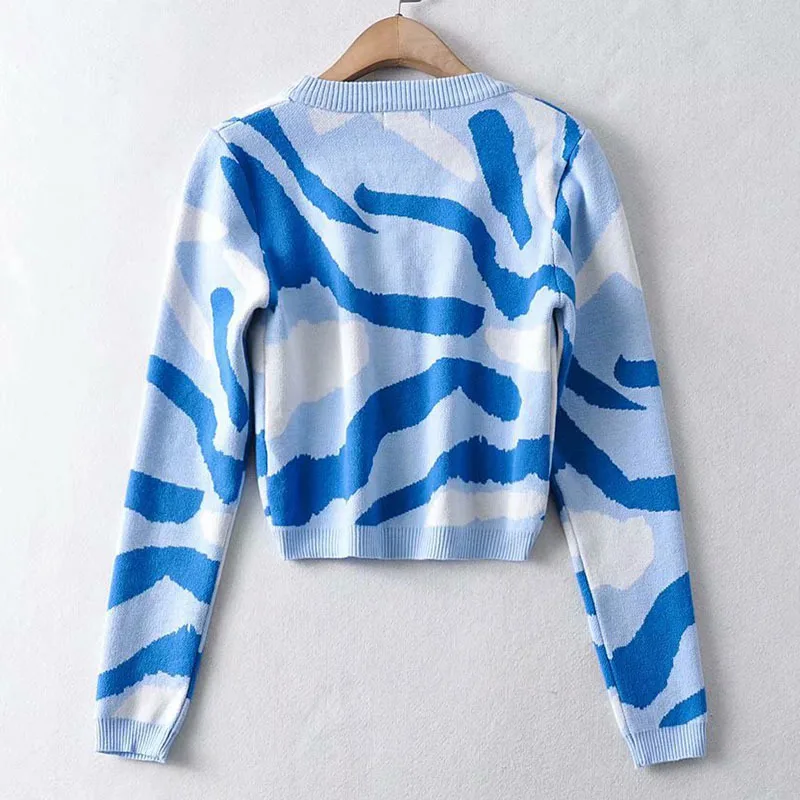 ZURICHOUSE Jacquard Cardigan Sweater Top Women Spring Long Sleeve V-neck Fashion Blue Water Ripple Camo Cropped Knit Coat